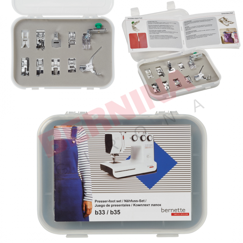 Este kit de prensatelas para la bernette b33 y b35 es perfecto para tener los prensatelas especiales para costura/labores con un precio muy especial.